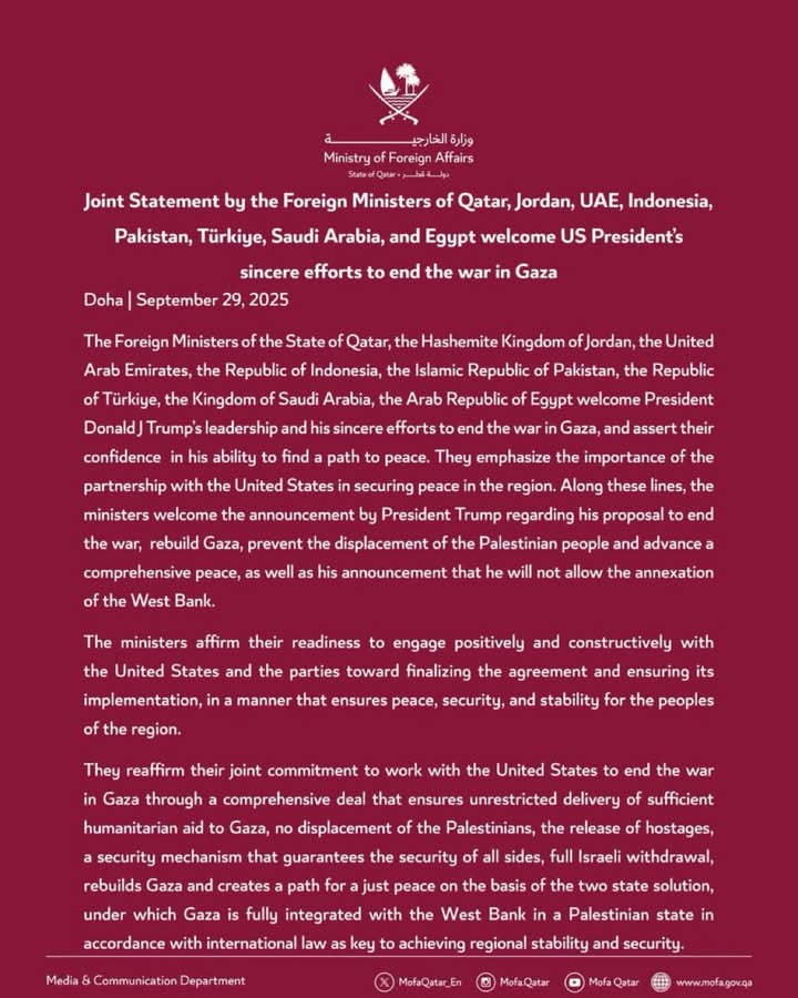 காஸாவில் போரை முடிவுக்குக் கொண்டுவர அமெரிக்க அதிபர் டிரம்பின் நேர்மையான முயற்சிகளை பாகிஸ்தான், கத்தார், ஜோர்டான், ஐக்கியஅரபு எமிரேட்ஸ், இந்தோனேசியா, துருக்கி, சவுதி அரேபியா மற்றும் எகிப்து ஆகிய நாடுகள் இணைந்து வரவேற்றுள்ளன.