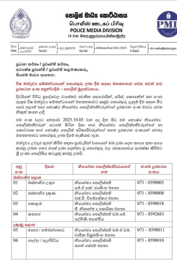 தீவு முழுவதும் போதைப்பொருள் நடவடிக்கைகள் குறித்த தகவல்களை நேரடியாக வழங்குவதற்காக, காவல்துறை இன்று (03) பல புதிய தொலைபேசி அழைப்புகளை அறிமுகப்படுத்தியுள்ளது.