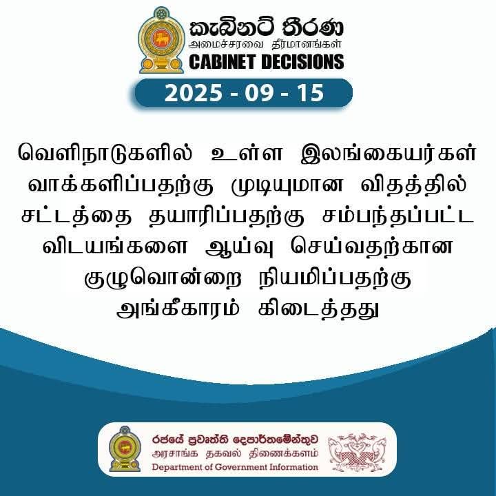 வாக்களிப்பதற்கு முடியுமான விதத்தில் சட்டத்தை தயாரிப்பதற்கு சம்பந்தப்பட்ட விடயங்களை ஆய்வு செய்வதற்கான குழுவொன்றை நியமிப்பதற்கு அமைச்சரவை அங்கீகாரம் கிடைத்துள்ளது.