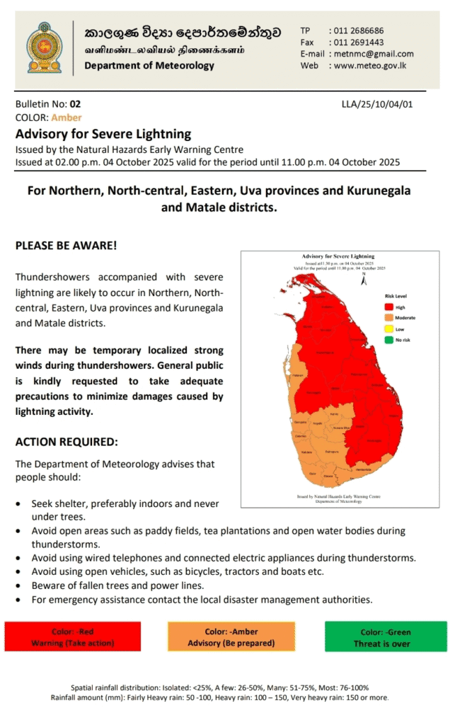 இடியுடன் கூடிய மழை பெய்யும் போது தற்காலிகமாக பலத்த காற்று வீசக்கூடும். மின்னல் தாக்கத்தால் ஏற்படும் சேதங்களைக் குறைக்க போதுமான முன்னெச்சரிக்கை நடவடிக்கைகளை எடுக்குமாறு பொதுமக்கள் கேட்டுக் கொள்ளப்படுகிறார்கள்.