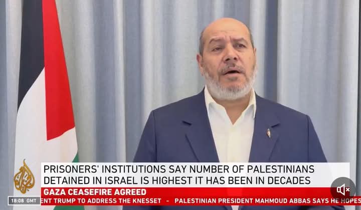 இன்று, போரையும் ஆக்கிரமிப்பையும் முடிவுக்குக் கொண்டுவருவதற்கான உடன்பாட்டை அறிவிக்கிறோம். இது நிரந்தரமான போர் நிறுத்தம், ஆக்கிரமிப்பு படைகளின் வெளியேற்றம், உதவிகளின் நுழைவு, ரஃபா கடவு இரு திசைகளிலும் திறக்கப்படுதல் மற்றும் கைதிகள் பரிமாற்றம் ஆகியவற்றை உள்ளடக்கியது. இதில் 250 ஆயுள் தண்டனை கைதிகள், அக்டோபர் 7க்குப் பின் கைது செய்யப்பட்ட 1700 காஸா மக்கள், மற்றும் குழந்தைகள் மற்றும் பெண்கள் அனைவரும் விடுவிக்கப்படுவர்.